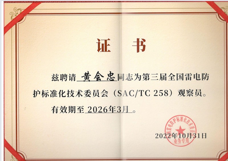 我司总经理黄会忠荣获“标准化人员能力评价证书”,并受聘担任全国雷电防护标准化技术委员会(简称“全国雷标委”)观察员,双项荣誉加身,不仅是对其个人在标准化领域专业能力与突出贡献的高度认可,更彰显了公司在防雷接地行业标准化建设中的深厚积淀与引领地位。